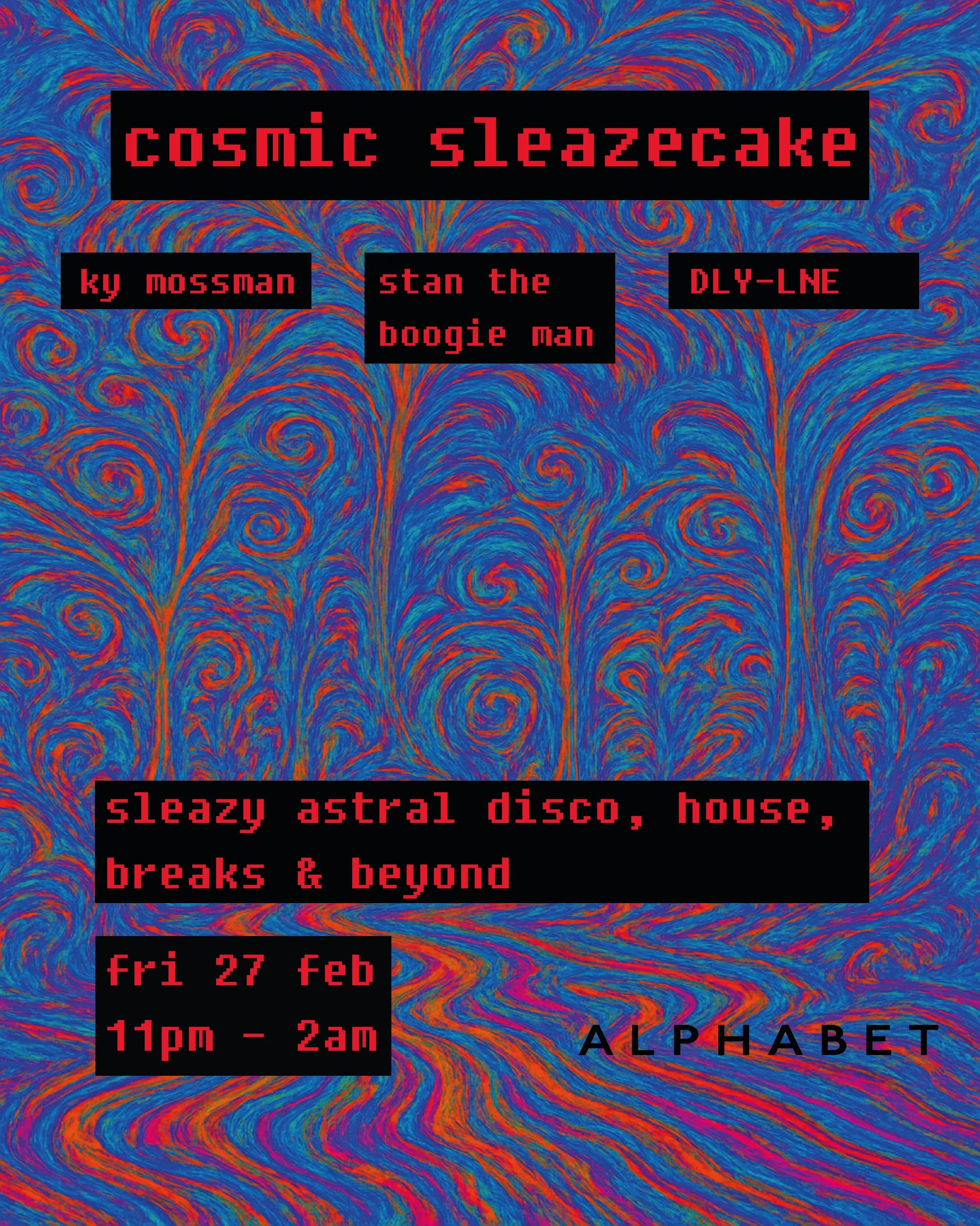 A night of sleazy space disco, cosmic house, breaks and beyond. Dripping with low-slung grooves, interstellar synths and late-night funk, Cosmic Sleazecake journeys from dusty disco basements to deep space dancefloors. Expect body-moving rhythms, warped melodies and a healthy dose of sleaze.