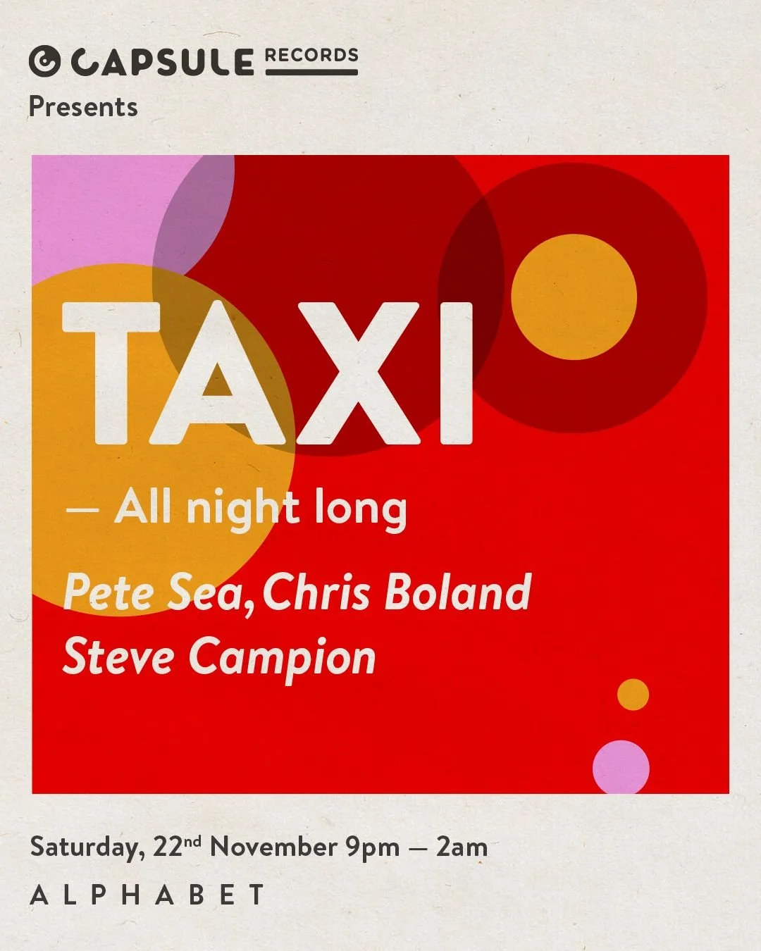 CAPSULE & TAXI PRESENT: TAXI ALL NIGHT LONG DATE: NOV 22TIME: 9am-2amTICKET: From £20 AGE: 18+ TICKETS